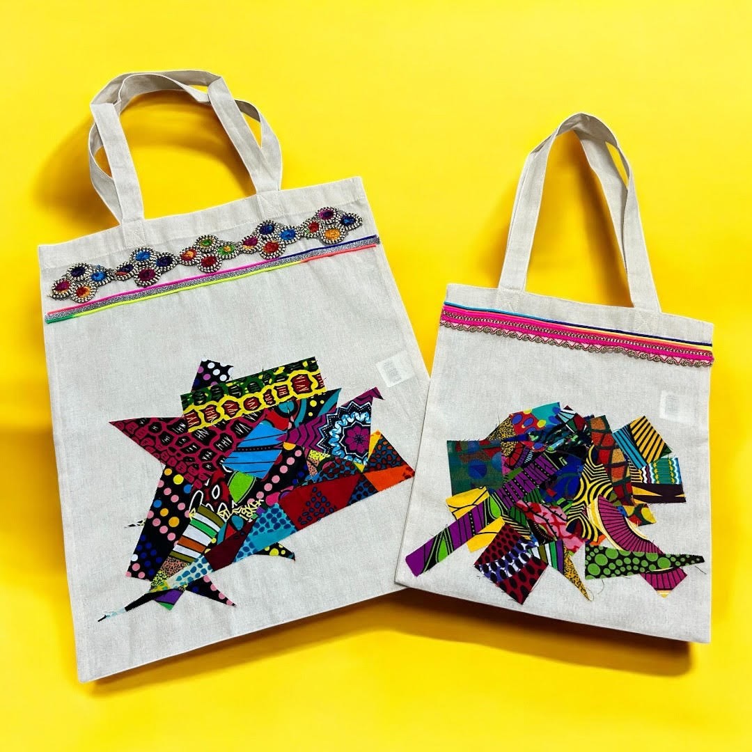 カラフルで個性豊かなアフリカ布を自由に組み合わせて、世界にひとつだけのオリジナル・トートバッグを作るワークショップです